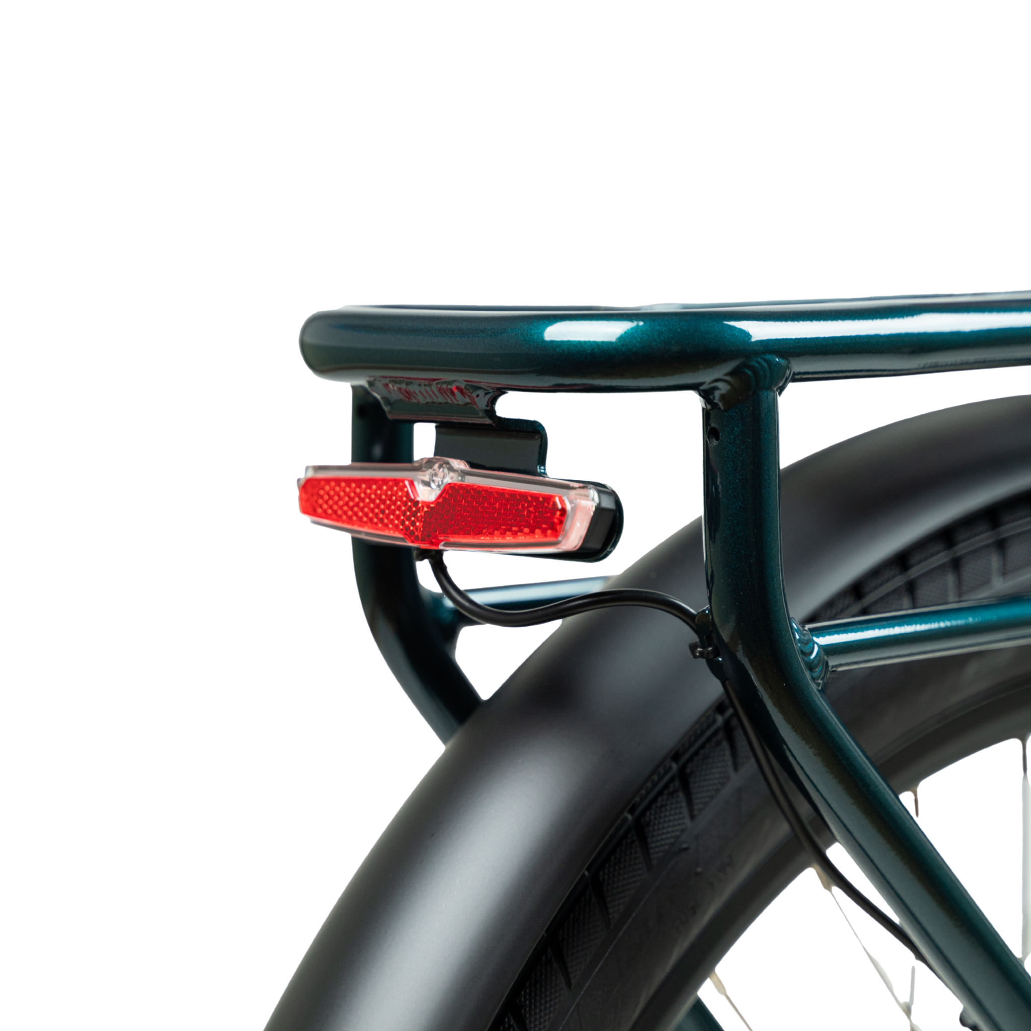 Yes — integrated front headlight, rear brake light, welded rack, full fenders, and a cafe lock mount.