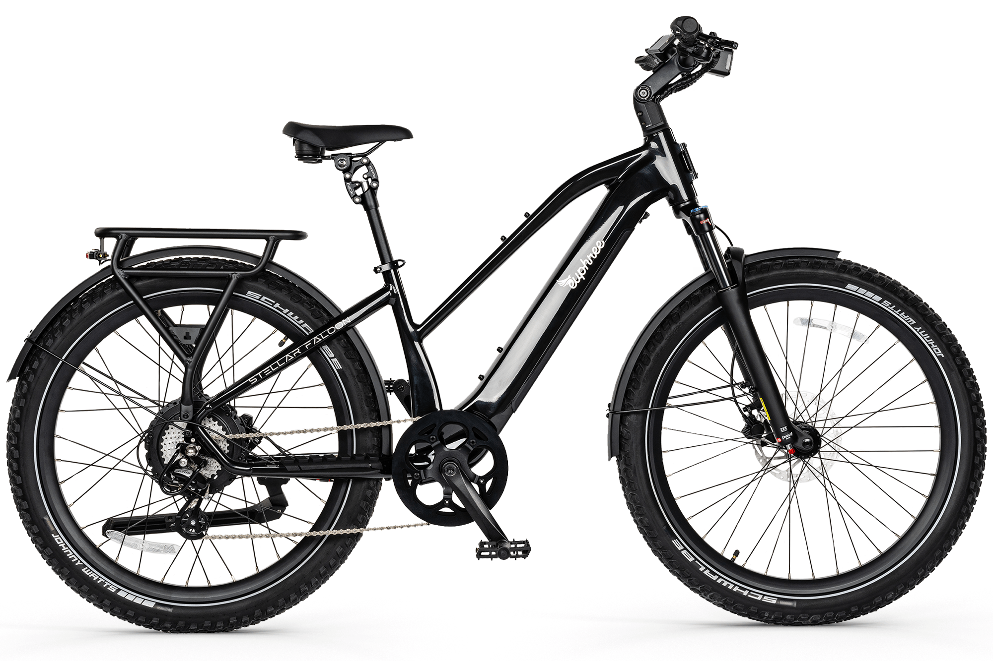 The Stellar Falcon Mid-Step is SGS certified to UL 2271 & UL 2849 (SGSNA/24/CQ/00032). A 200-lumen headlight, rear brake light with 220° visibility, and Tektro hydraulic disc brakes keep you safe and in control day or night.